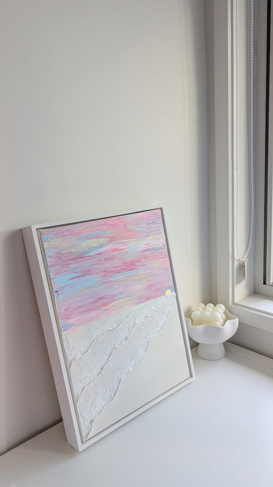 Textured Coastal Wall Art – Ocean Waves Sunset in Pink & White – White Wash Frame – 42×32cm