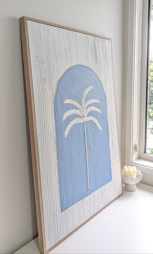Coastal Blue Palm Tree Arch Textured Wall Art | Coastal Artwork in Blue 90x60cm