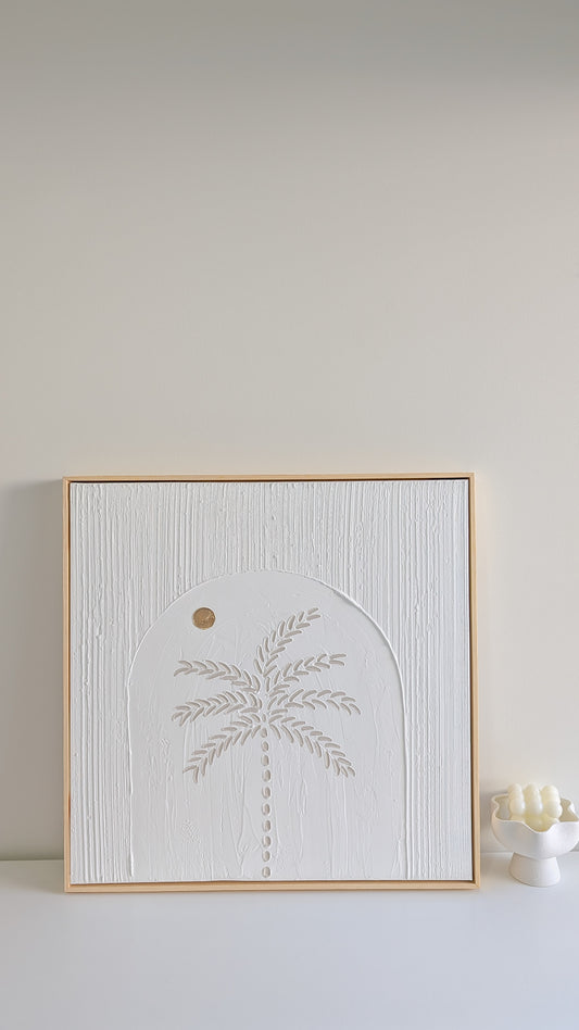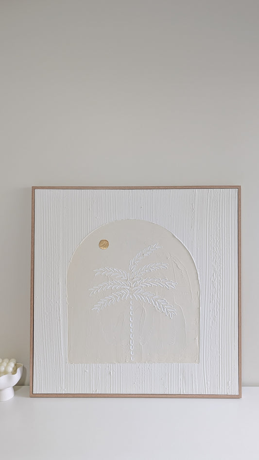 Coastal Palm Tree Sunset Arch Textured Wall Art | Coastal Artwork in Neutral - Cream - 80x80cm