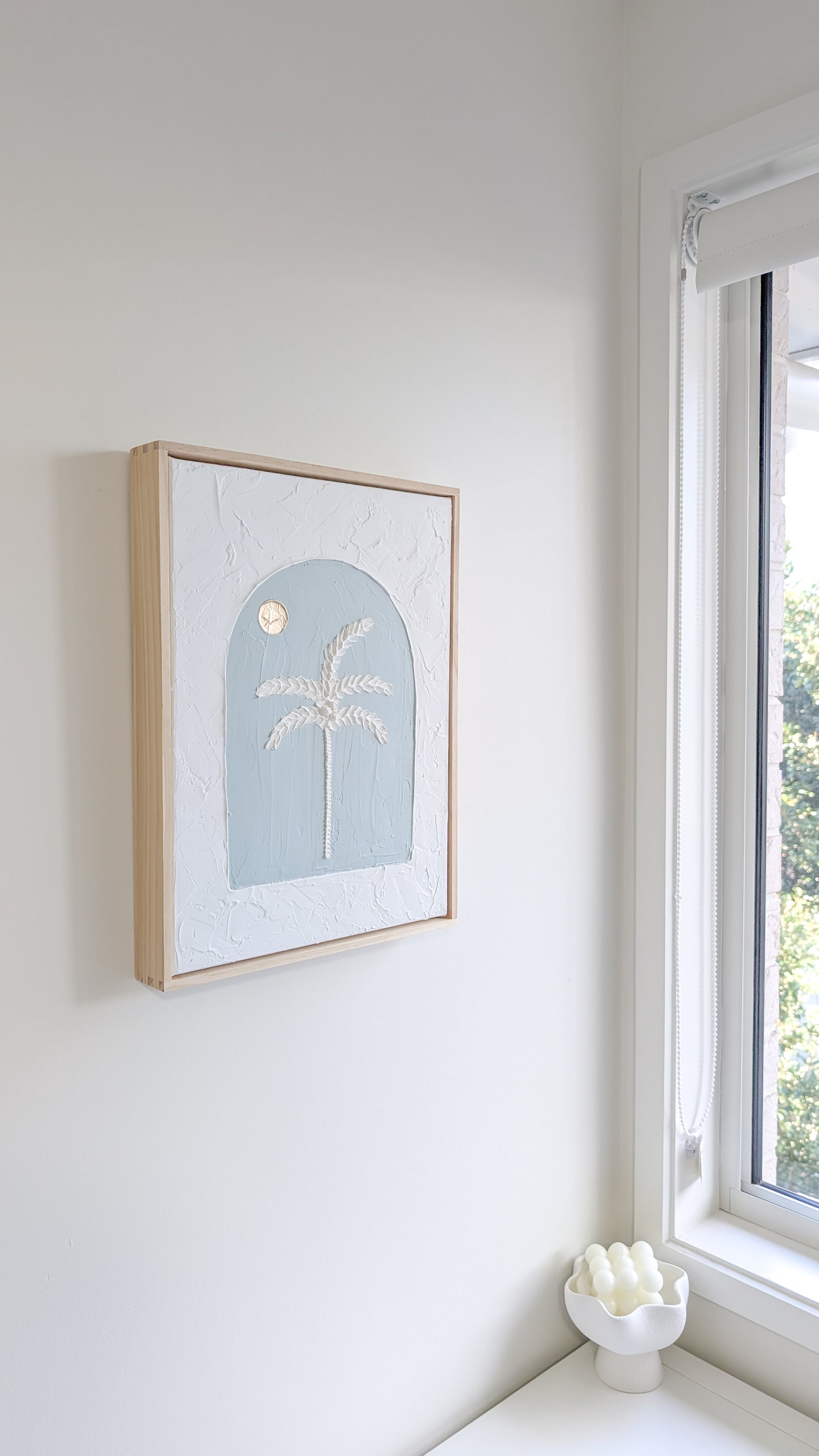 Coastal Palm Tree Arch Golden Sunset Textured Wall Art – Coastal Beach House Artwork Light Blue 42x32cm | Coastal Collection |