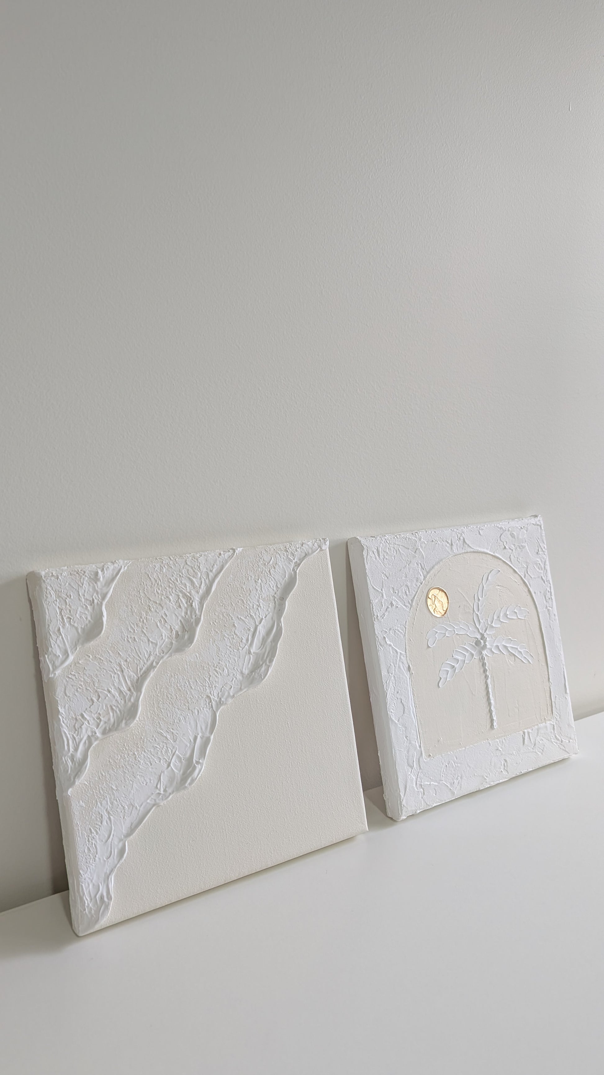 Textured Art Duo Ocean Waves & Palm Tree Golden Sunset Wall Art Minis Cream & White Set of 2 - 20x20cm | Coastal Collection |